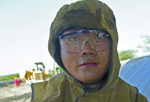 40攝氏度的高溫下,焊工也要穿上厚厚的焊服。一道焊口焊下來,焊工的衣服都被汗水浸透了。