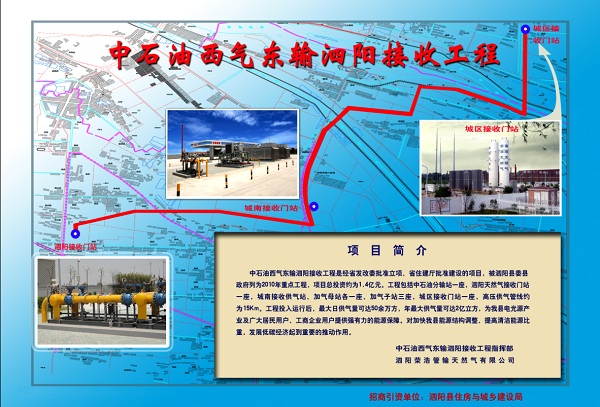 泗陽天然氣項目三期工程即中石油西氣東輸泗陽接收工程,是經(jīng)省發(fā)改委批準立項、省住建廳批準建設的項目,是泗陽縣委、縣政府2010年重點民生工程,項目總投資約為1.2億元。工程包括泗陽天然氣接收門站一座,城南高中壓調(diào)壓站、壓縮母站和加氣站各一座,城區(qū)高中壓調(diào)壓站加氣站各一座,高壓供氣管道15公里。工程于2010年8月15日開工,12月28日全面竣工,2011年1月28日試運行,2月28日正式分輸供氣。2011年3月19日,泗陽縣委、縣政府在榮浩集團辦公大樓前舉行了隆重的投產(chǎn)通氣儀式,宿遷市副市長趙深、泗陽縣委書記李榮錦等四套班子領(lǐng)導出席了儀式;中石油西氣東輸銷售公司總經(jīng)理助理李世泉同志也出席了投產(chǎn)儀式,并發(fā)表了熱情洋溢的講話。該工程投入運行后,最大日供氣量可達200余萬立方米,年最大供氣量可達6億立方米,為泗陽及周邊縣市眾多工商企業(yè)用戶提供強有力的能源保障,對加快蘇北能源結(jié)構(gòu)調(diào)整、提高清潔能源比重、發(fā)展低碳經(jīng)濟、促進節(jié)能減排都將起到重要的推動作用。